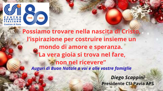 Si coglie l’occasione per comunicare che la Segreteria CSI rimarrà chiusa dal 24 dicembre 2025 al 4 gennaio 2026. Riprenderà la sua regolare funzionalità a partire dalle ore 15:00 di lunedì 5 gennaio 2026. Durante il periodo di chiusura sarà comunque possibile contattarci scrivendo a csipavia@csipavia.it; l’email rimarrà sempre monitorata.